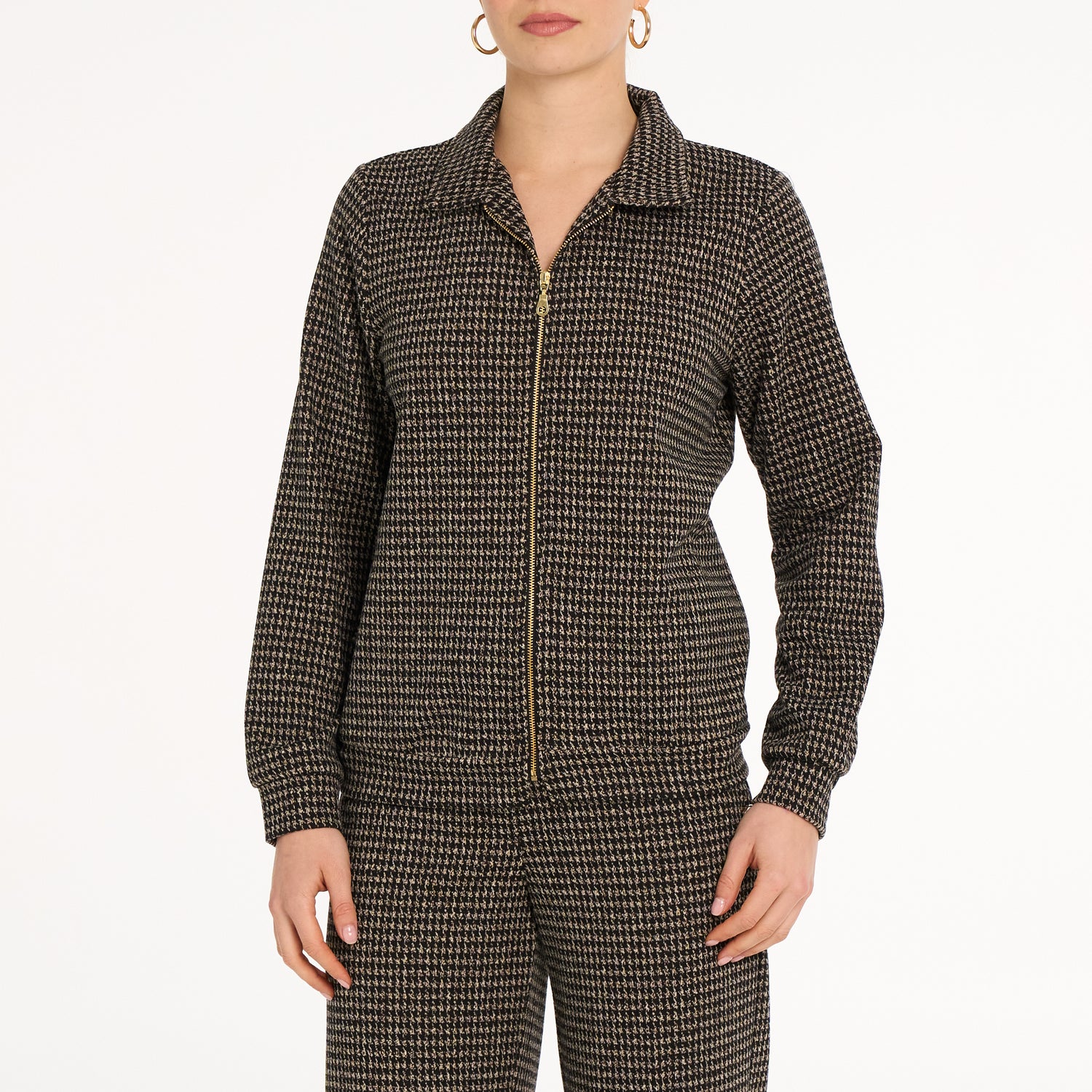 Add a splash of style to your wardrobe with this playful micro houndstooth jacket. Designed with convenient zipper and pockets, it keeps your essentials secure while on the go. Crafted from a stretchy knit fabric, it offers all-day comfort and flexibility, making it perfect for both casual outings and more polished looks. Brighten up your day with this effortlessly cool jacket that moves with you!