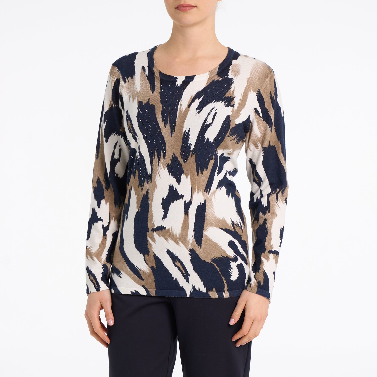 Indulge in this lightweight faux cashmere crewneck sweater. Crafted from soft, high-quality knit material, this multi patterned sweater features a sophisticated hot fix detail adding a little bling to a beautiful bold print for added sophistication.