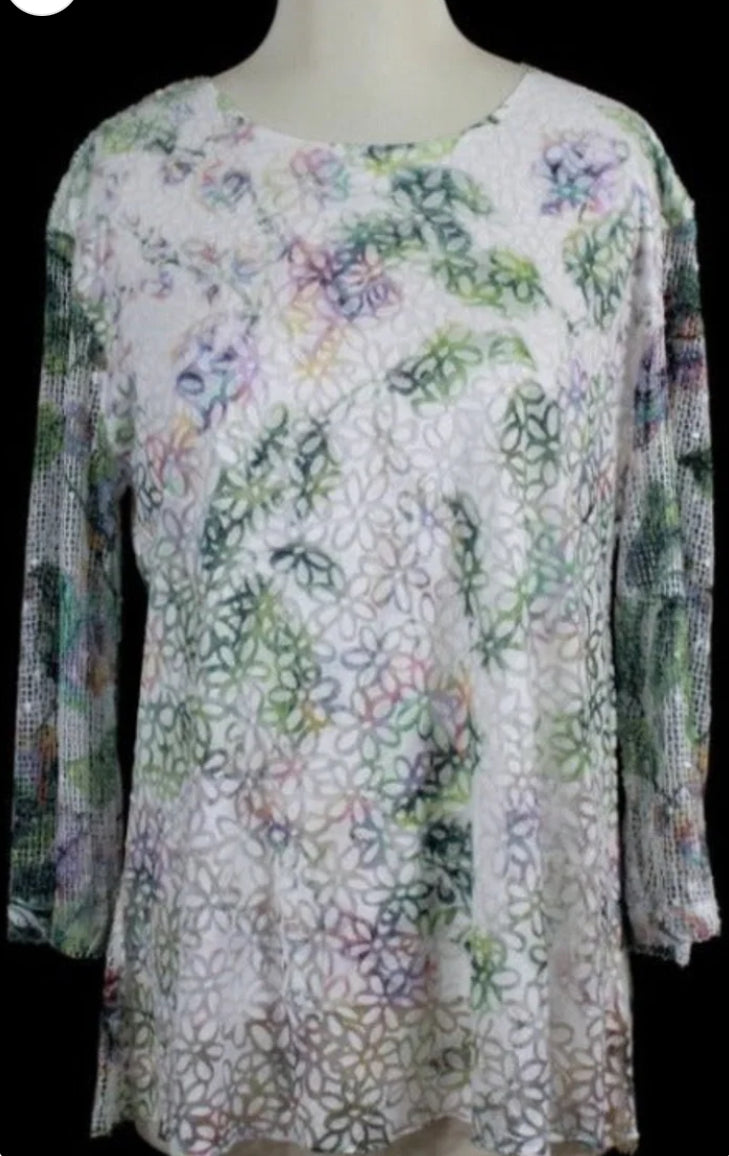 Light layered tunic top and a beautiful, soft floral print with accent lace sleeves