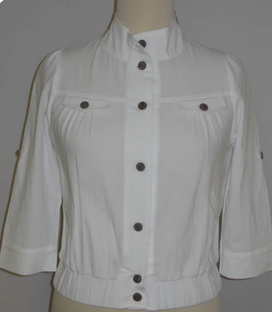 It's a lightweight bomber style jacket in white, dotted with grey buttons.